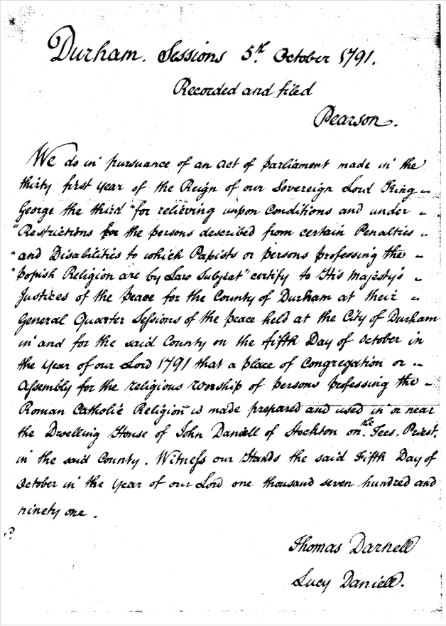 Below is copy of the registration transcript (dated 5th October 1791) giving permission for a chapel in the residence of John Daniell (a Roman Catholic Priest) of Stockton-on-Tees. This chapel was used up until 1842 when our current Church was opened.